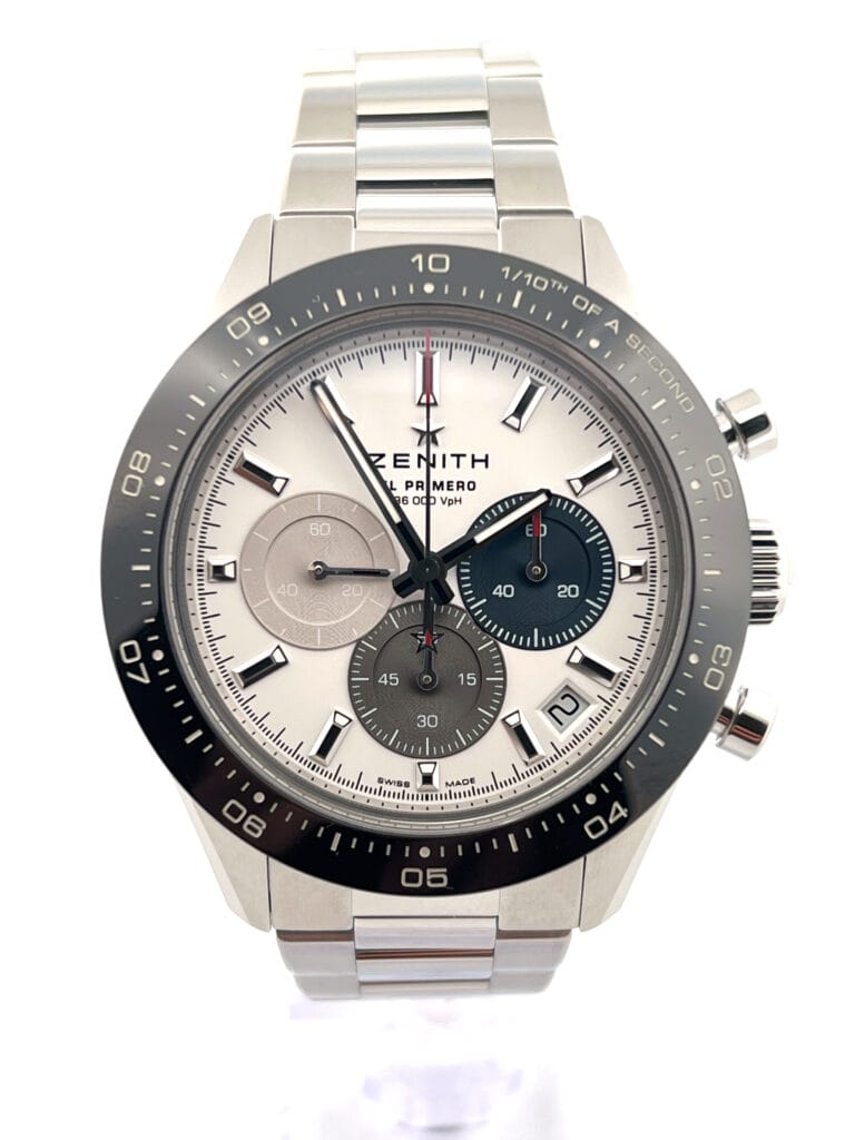 The Zenith El Primero Chronomaster Sport is a bold evolution of the brand’s chronograph legacy—modern in design yet unmistakably rooted in one of watchmaking’s most storied calibres. With its 41mm stainless steel case and polished ceramic bezel, it carries the athletic elegance of a contemporary sports chronograph, while paying homage to the DNA of the original El Primero lineage.