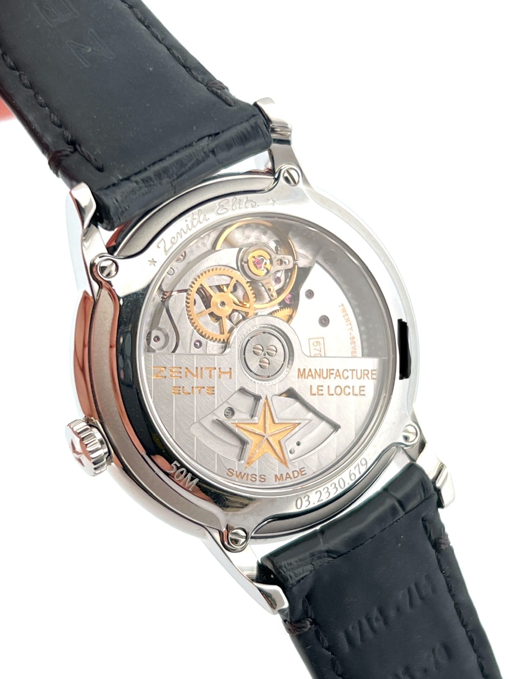 At its heart is the in-house Zenith Elite 679 automatic movement, admired for its slim construction and reliable 50-hour power reserve. Visible through the sapphire case back, it adds a touch of mechanical beauty to this elegant piece.