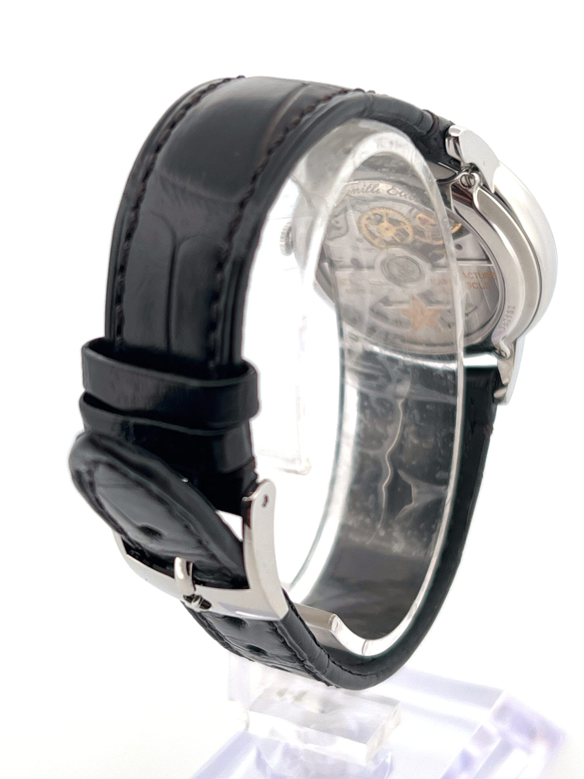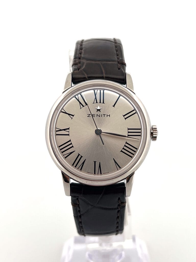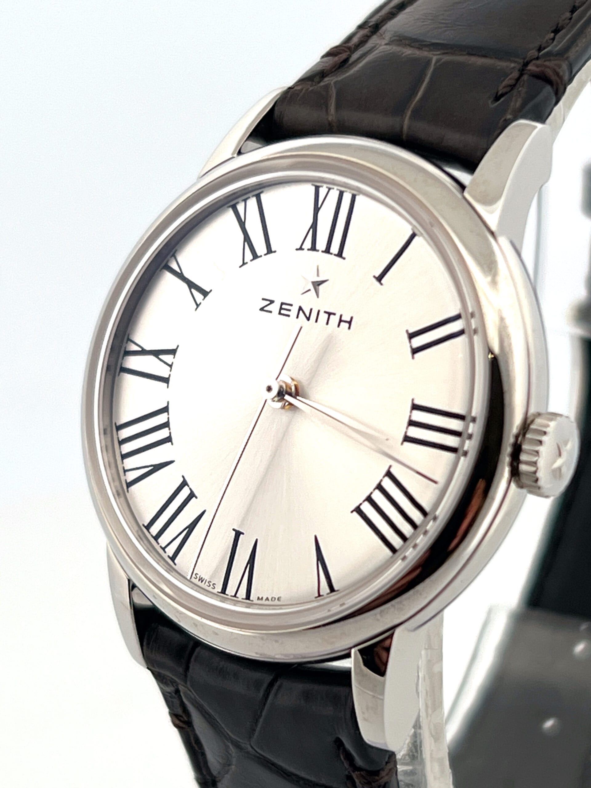 The silver sunray-patterned dial radiates a soft, timeless glow, punctuated by delicate faceted hour markers and slim, leaf-shaped hands. Its minimalist aesthetic is a testament to Zenith’s dedication to purity in design — allowing the quality of materials and craftsmanship to quietly shine through.