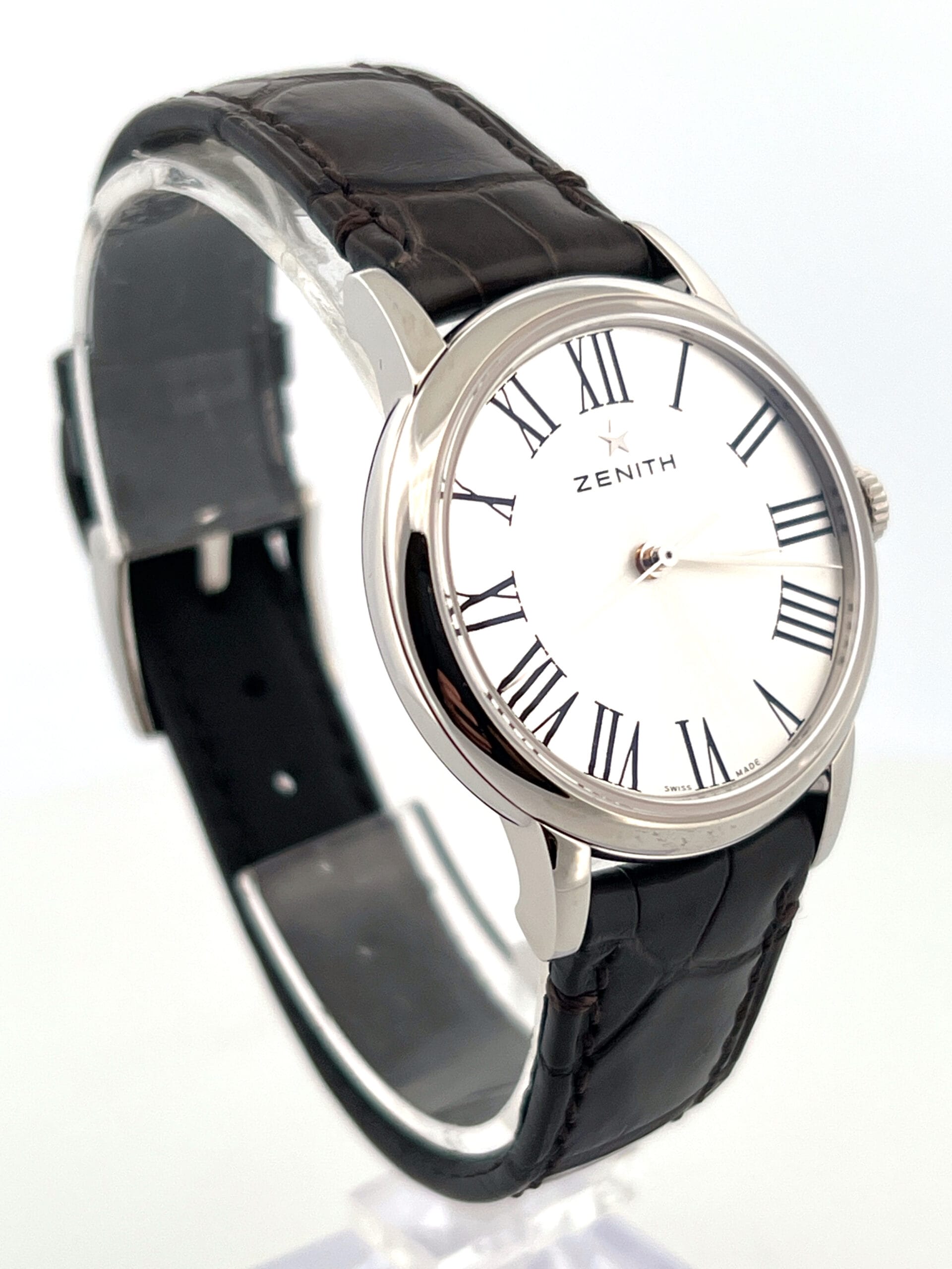 The Zenith Elite Ultra Thin Lady (Ref. 03.2330.679) is a graceful expression of understated elegance, perfectly balancing classic watchmaking with contemporary refinement. Encased in a polished 33mm stainless steel case, its slender 7.55mm profile sits effortlessly on the wrist, offering a discreet yet sophisticated presence.
