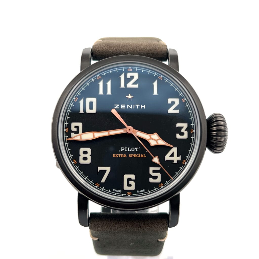 The matte black dial is simple yet striking, with oversized luminescent Arabic numerals that ensure outstanding readability. Powered by the Zenith Elite 679 automatic movement, it offers reliable timekeeping with just hours, minutes, and central seconds—no fuss, just pure functionality. With a 50-hour power reserve, it’s ready for whatever your day demands.